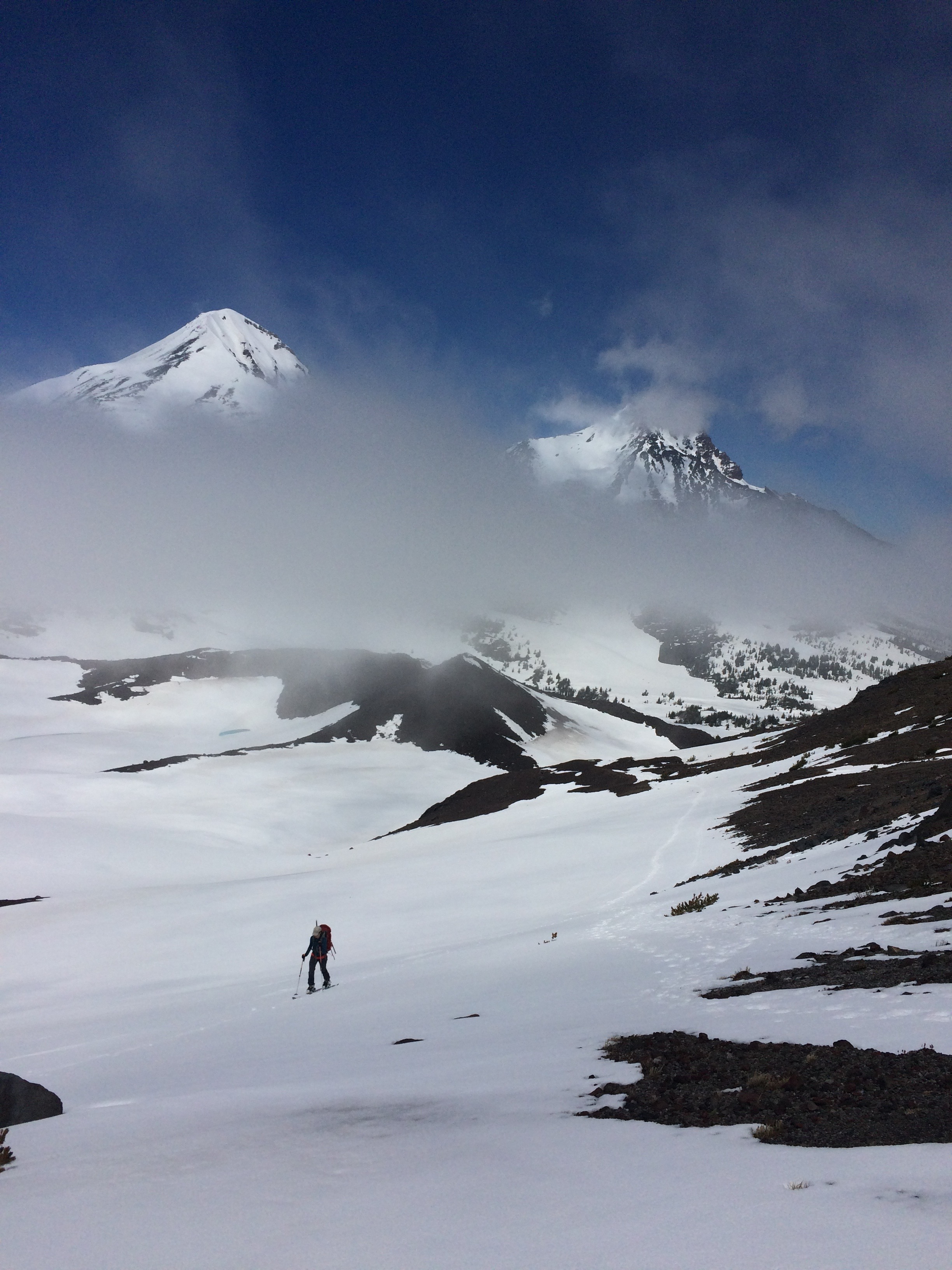 Day 1: Lucky for us, the Cascade Lakes Scenic Byway into the Three Sisters Wilderness had opened the day before the start of our trip, making the approach to the Green Lakes area manageable (4 miles of road walking would have been very no bueno). After waiting out a rain squall in the car, we packed up and had one of those no-seriously-how-is-my-bag-possibly-this-heavy moments, with skis, crampons, warm clothes and three days of food all factored in.