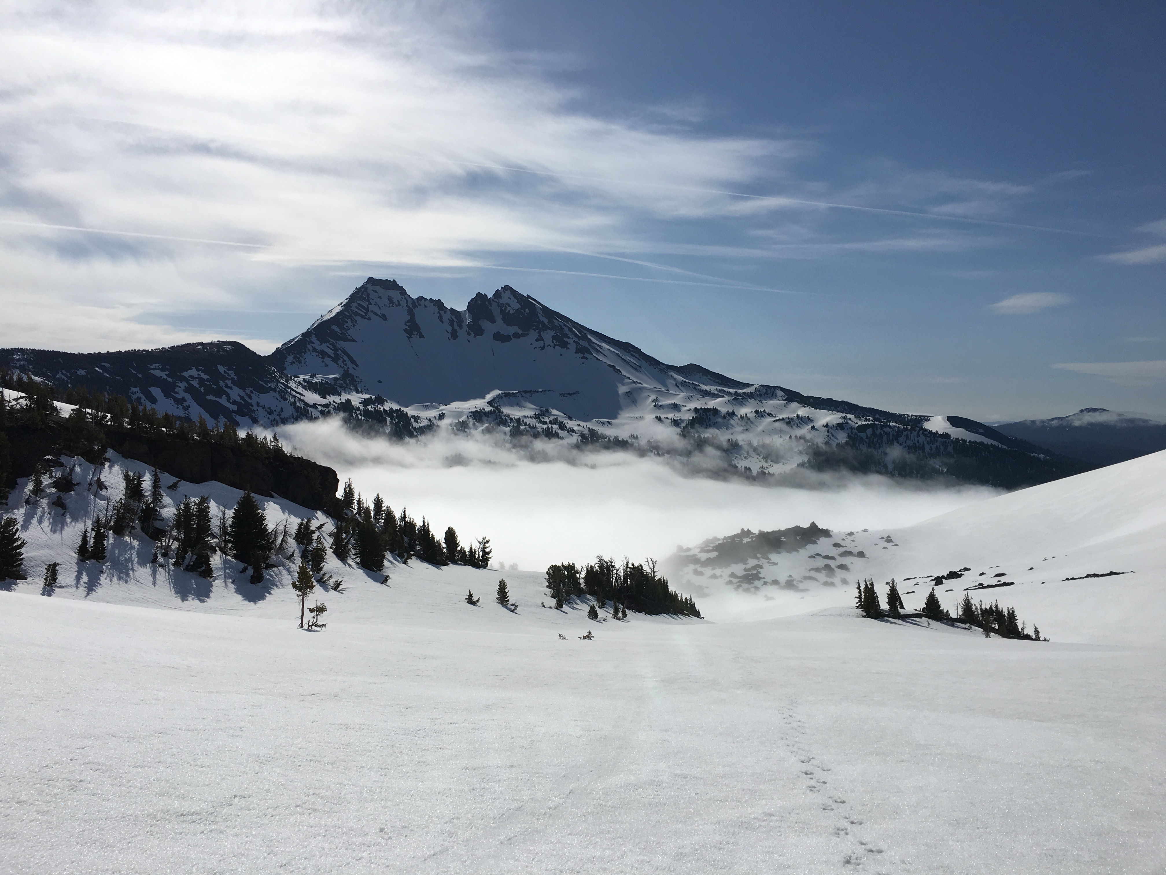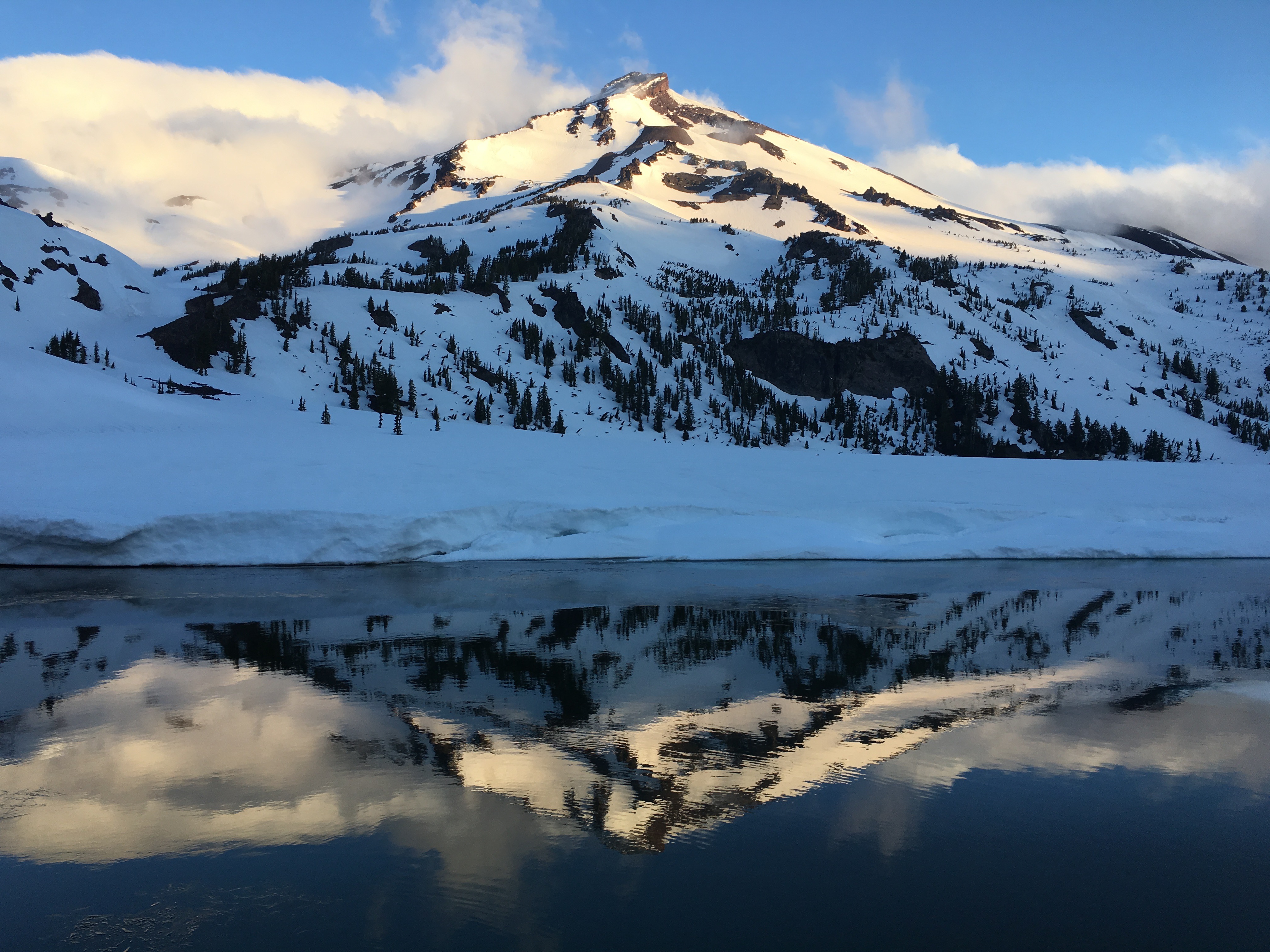 The skinning started within a mile and was mostly easy, with the exception of a couple of melted-out footbridges that required some shuffling. We made it to the lakes around 7 p.m. and quickly set up camp with a plan to get up early and ski toward Middle Sister.