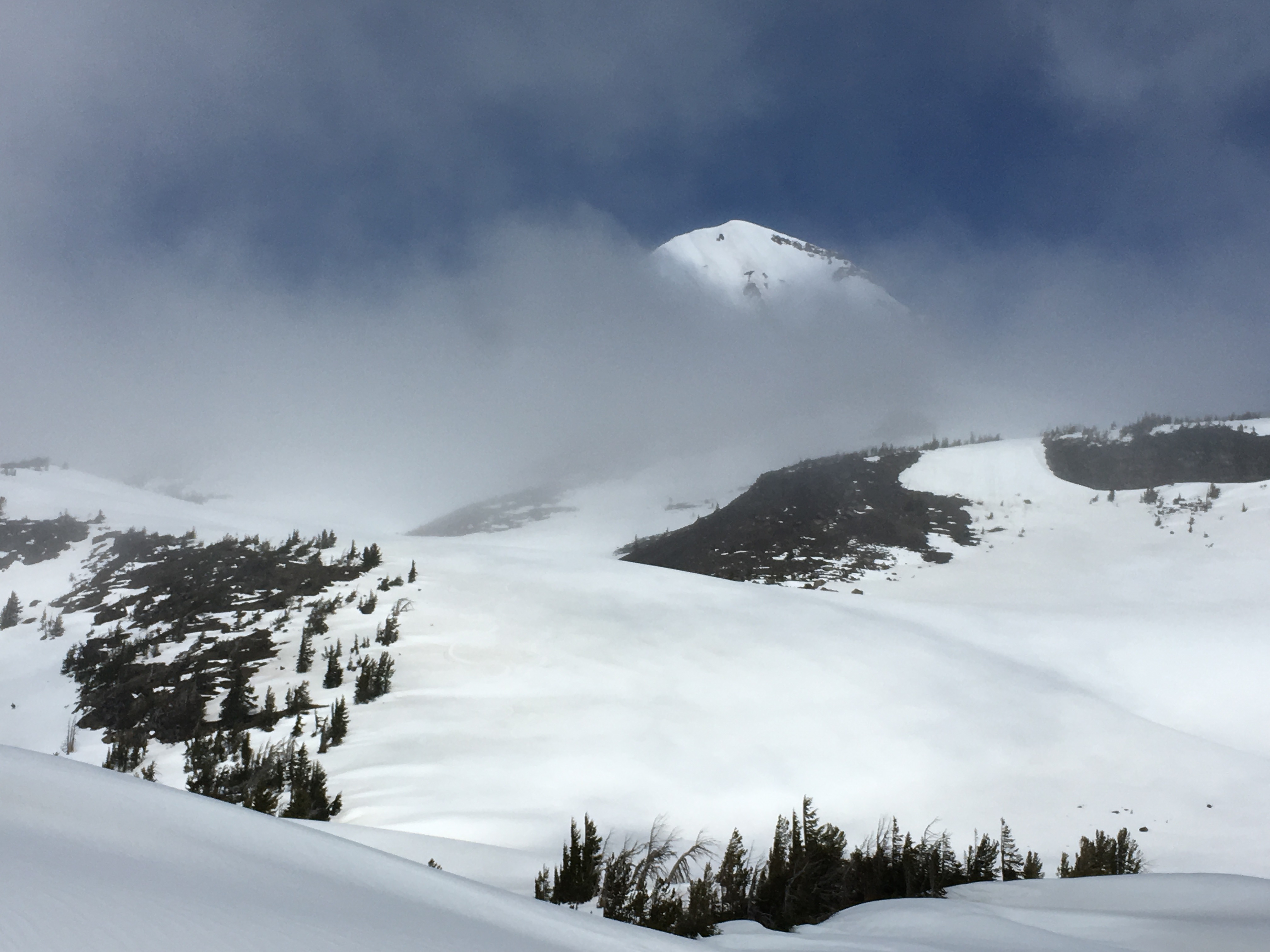 The weather rolled in and out between South and Middle all morning, with the peaks completely socked in for a good chunk of it. Around noon, we got to a saddle close to north and could see a clear path up with some nice tracks coming down the ridge. But as we started to climb, we realized the snow was already too manky to make a lot of progress. After a lot of hesitation, we ended up calling it due to the late hour, soft snow, and lack of visibility.